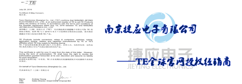 南京捷應(yīng)電子有限公司是國際無源器件品牌美國泰科電子(TE)在中國華東地區(qū)的主要通路商,代理經(jīng)銷旗下全系列產(chǎn)品包括TYCO(AMP)系列連接器、接插件、OEG、SCHRACK、P&B功率繼電器、美國RACHEM各類航空導(dǎo)線、熱縮套管、模縮套、標(biāo)識(shí)產(chǎn)品、電線電纜。